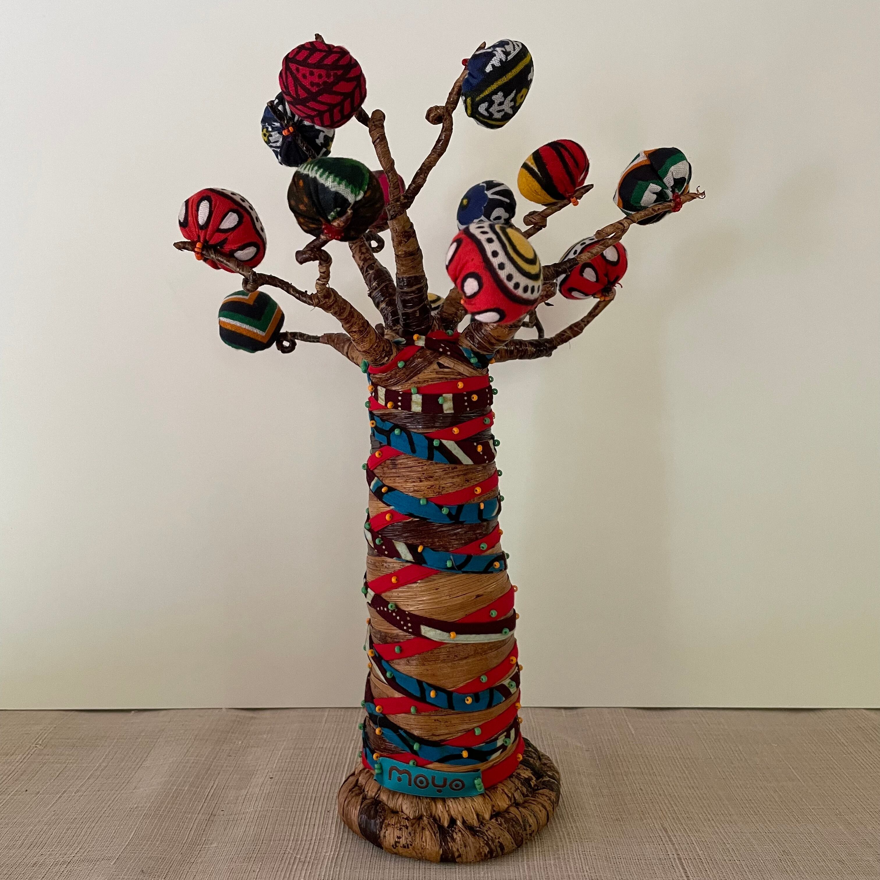 アフリカを象徴するバオバブの木をバナナの皮で作ったオブジェ、鮮やかな色彩と柄が魅力のキテンゲやカンガと言うコットン100%のプリント生地でテープやボンボン、更にビーズやスパンコールでデコレーションしています。商品は手作りのため柄の出方、ビーズ使いなども異なった1点ものです。また枝の中にはワイヤーが使われているので枝の形はお好みで変える事も可能なのでお好みの形にして楽しんでください。ネックレスやブレスレットの一時置きとしても可愛いです。1本あるだけでも華やかですが、大きさも3サイズありますのでサイズ違いを2本、3本一緒飾るともっと楽しい気分になりますよ。