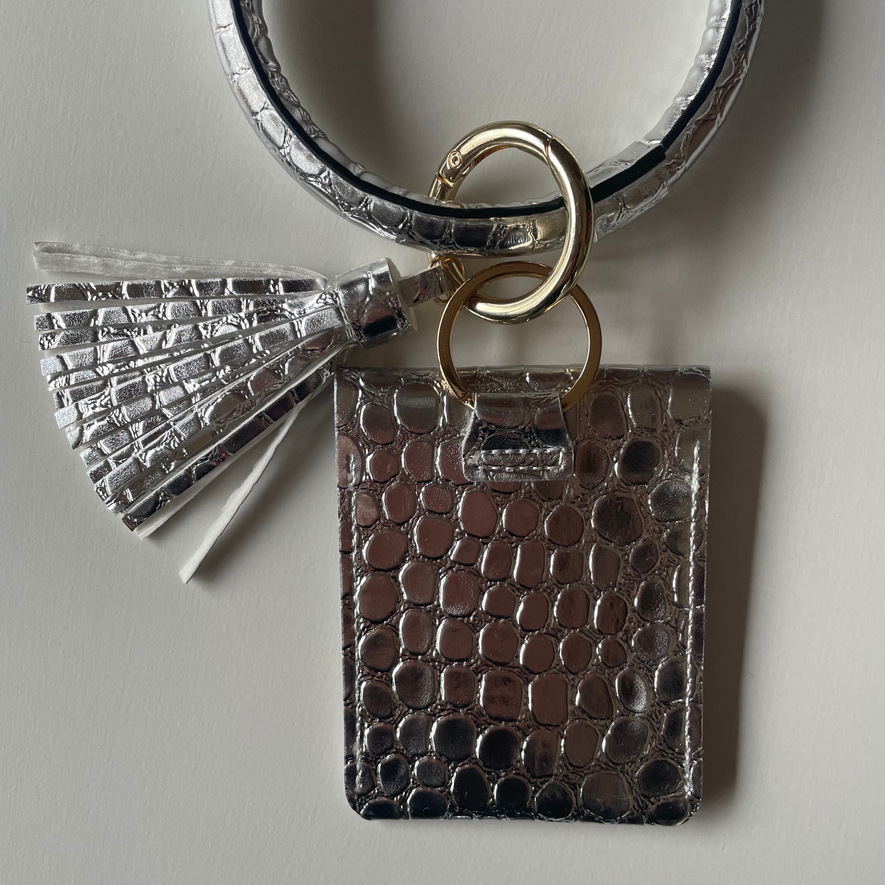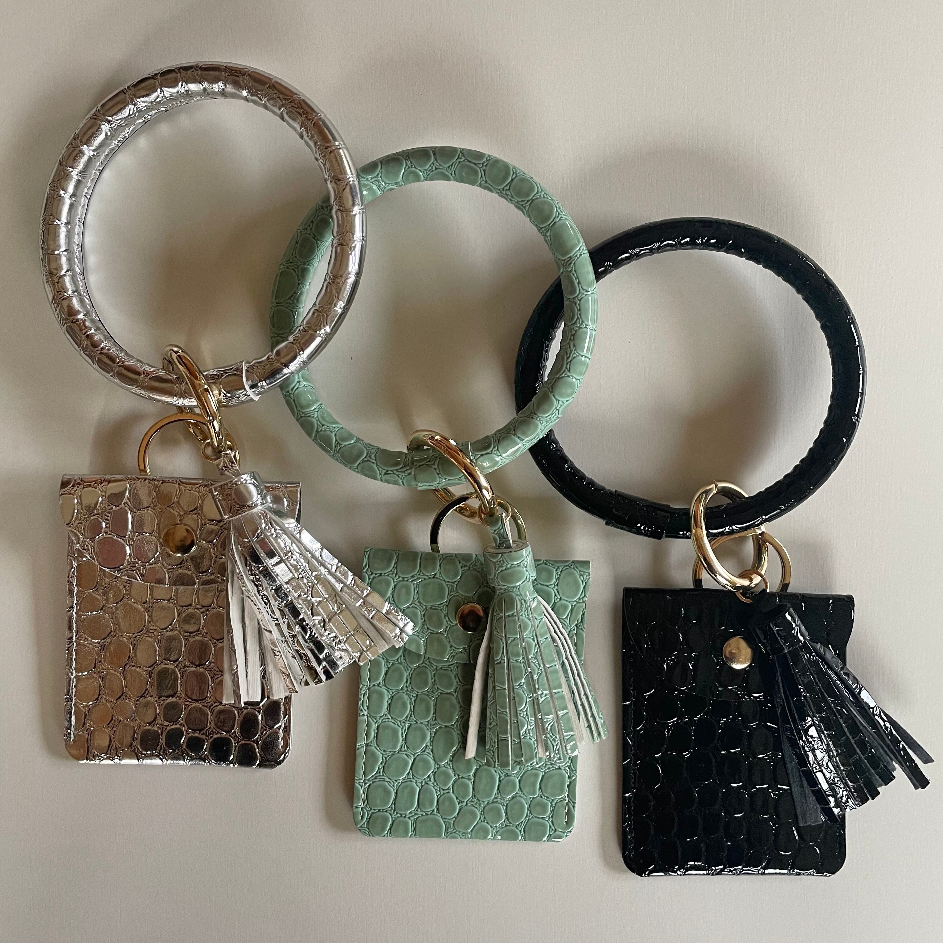 カードケースがついたブレスレットタイプのキーリングです。ブレスレットのように腕にかけて使用します。もちろんバッグにかけての使用も。スマホホルダーを使えば手首にかけたまま操作でき、落とす心配もなくなりますよ。アクセサリー感覚で使えるのが推し!エナメル調のエレガントなクロコ柄が大人の小物という感じです。カードケース付きなので車の鍵と共に、ETCカード、ガソリンカードなど車関連に合わせて使うと便利です。