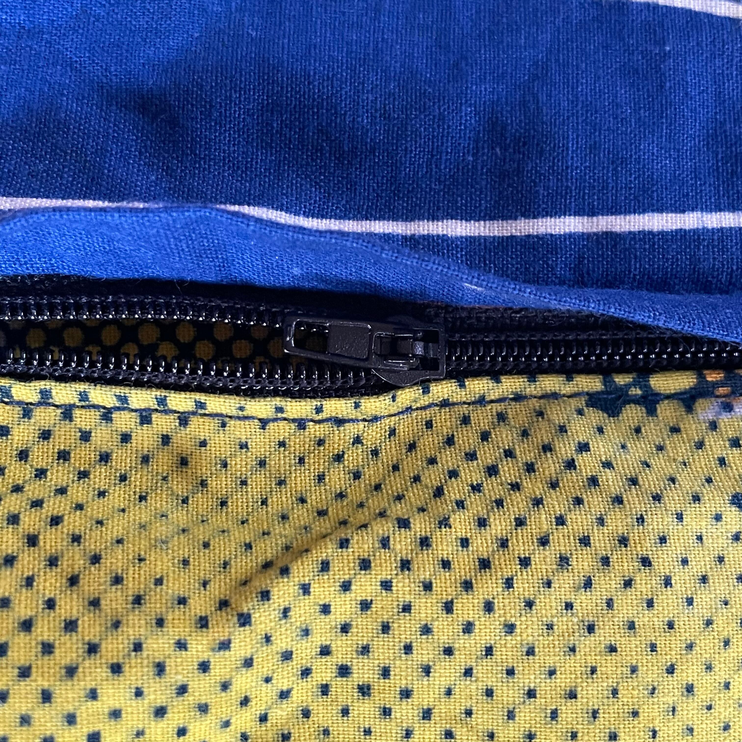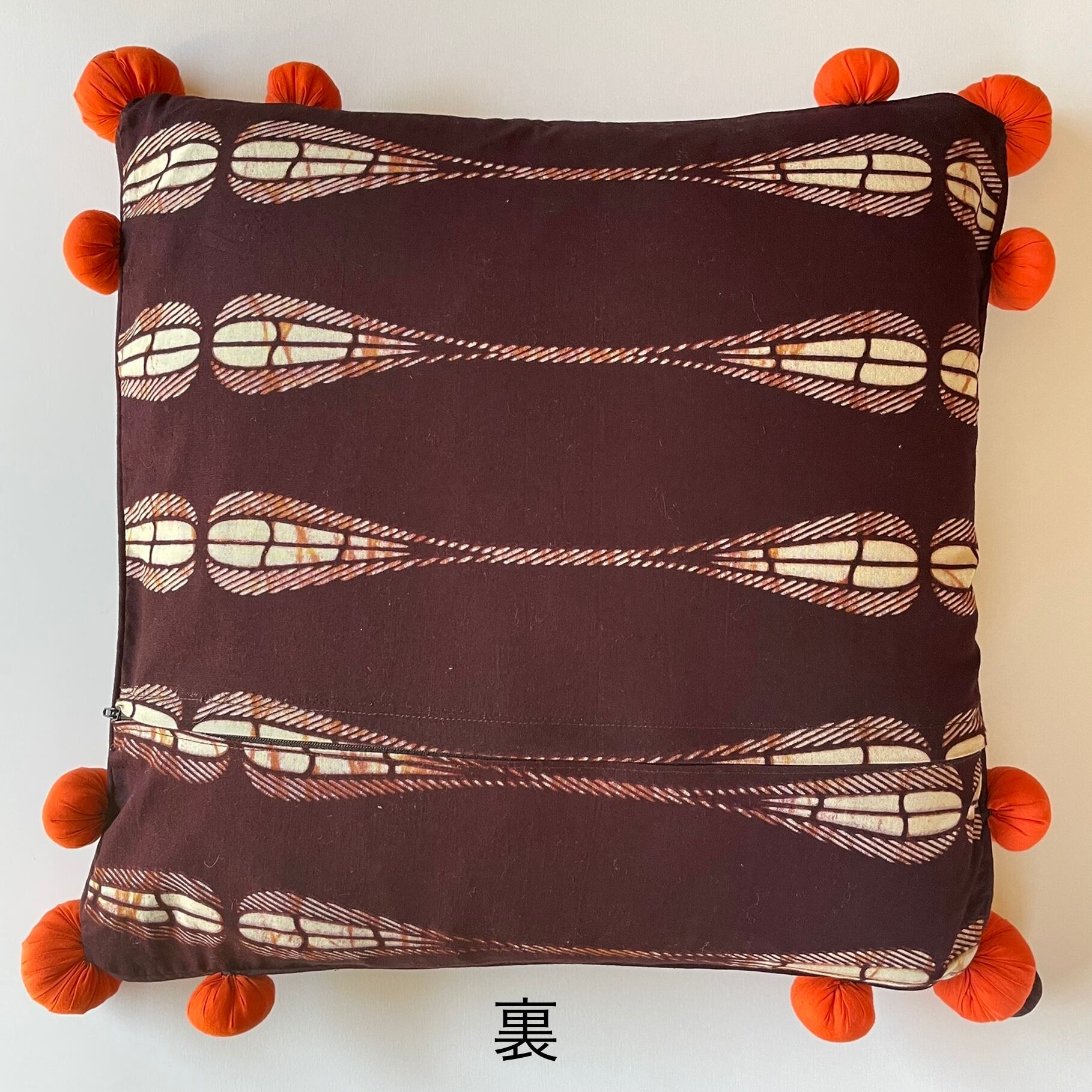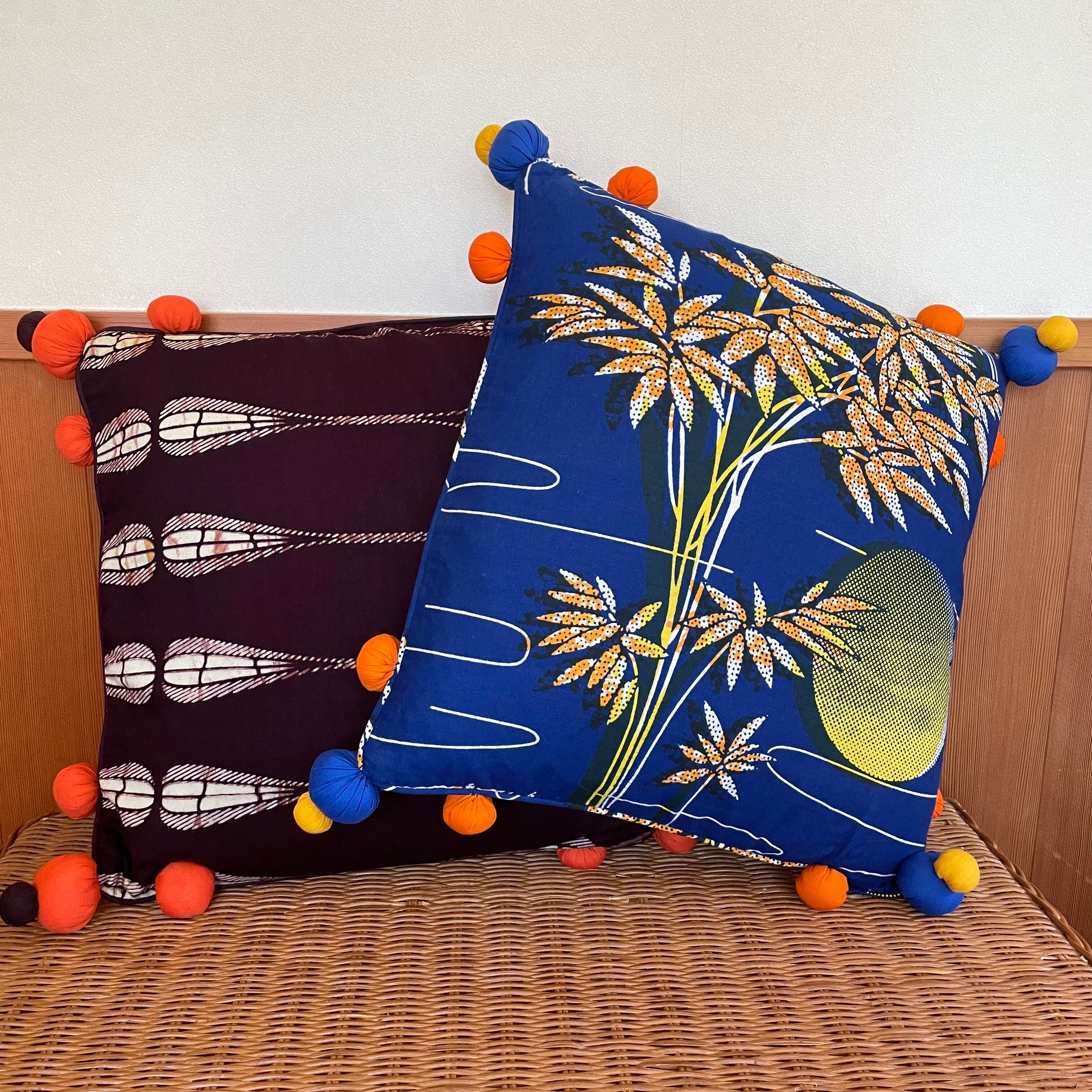 アフリカらしい鮮やかな色彩と柄が魅力のキテンゲと言うコットン100%のプリント生地を使い、4つ角にボンボンをあしらったオシャレなクッションカバーです。詰め物をしないフラットな状態ならテーブルのセンターへ置いて使ったり、チェストの上に敷いて小物などを飾るとおしゃれ度UPです。是非インテリアのアクセントとして取り入れてください。