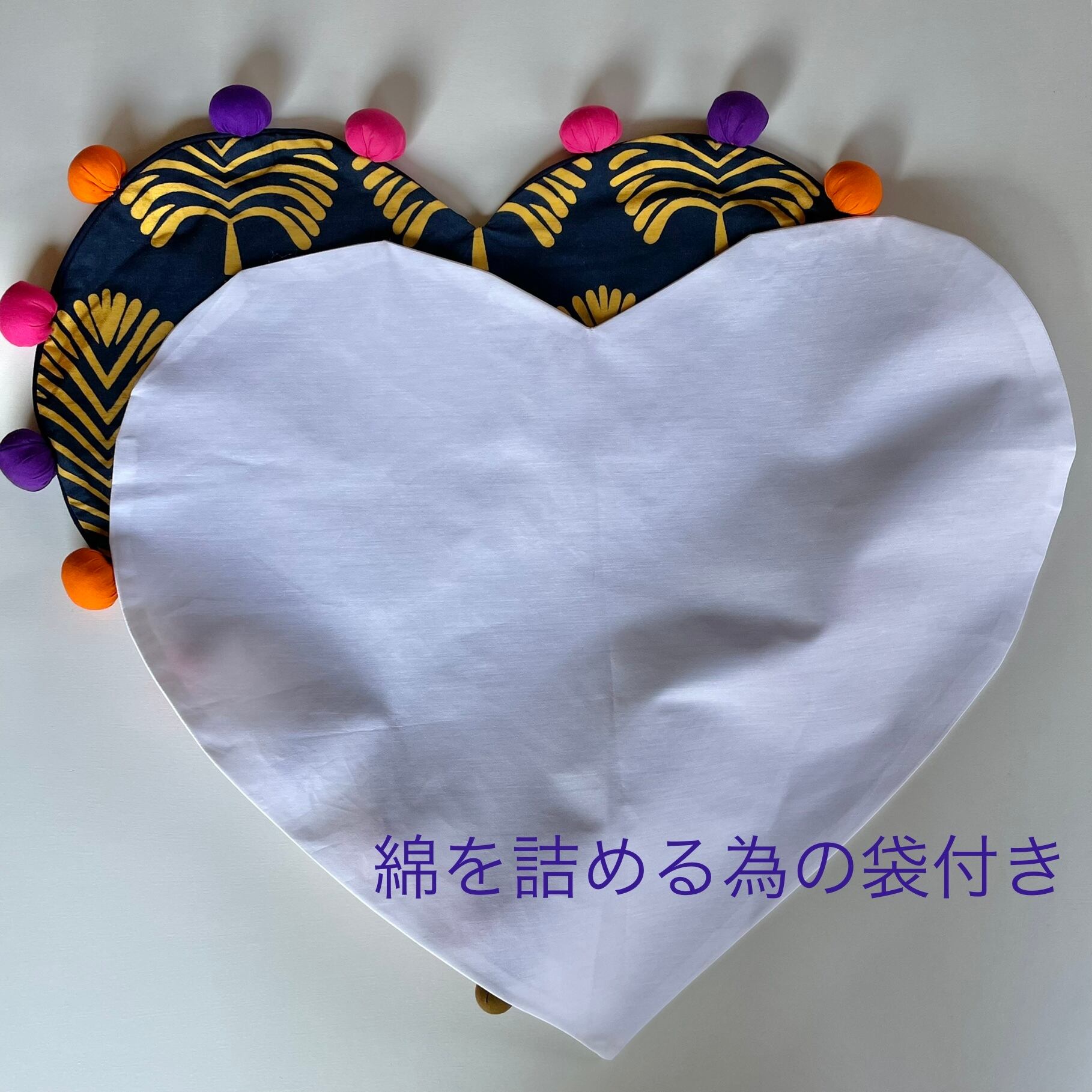 アフリカらしい鮮やかな色彩と柄が魅力のキテンゲと言うコットン100%のプリント生地を使い、周りにボンボンをあしらったオシャレなクッションカバーです。詰め物をしないフラットな状態ならテーブルのセンターへ置いて使ったり、チェストの上に敷いて小物などを飾ってもオシャレです。ハート好きにはたまらないですよ。是非インテリアのアクセントとして取り入れてください。