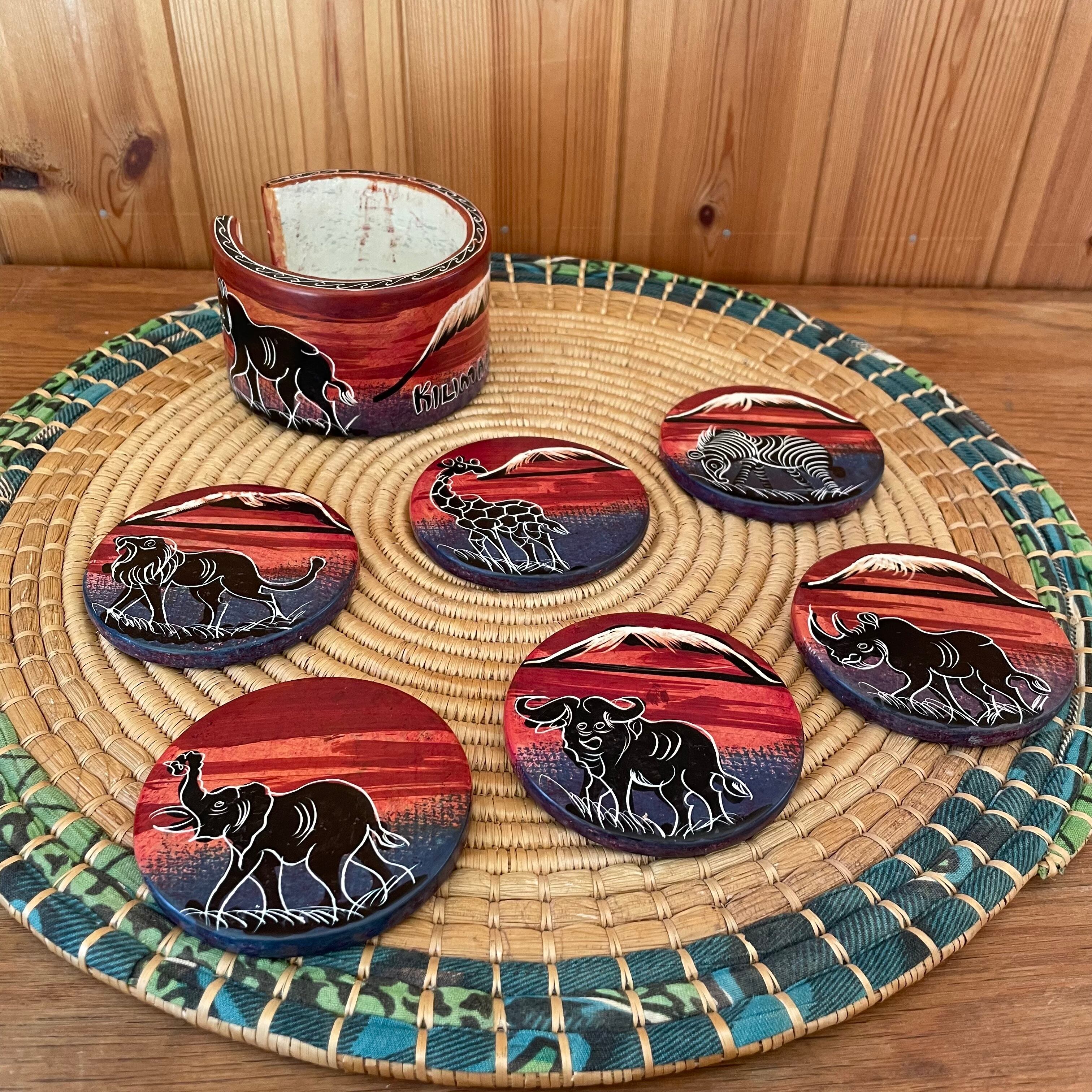ソープストーン(滑石)と言う石鹸のような、しっとりとした質感の石を加工し、動物の絵を手描きした入れ物とコースター6枚のセットです。