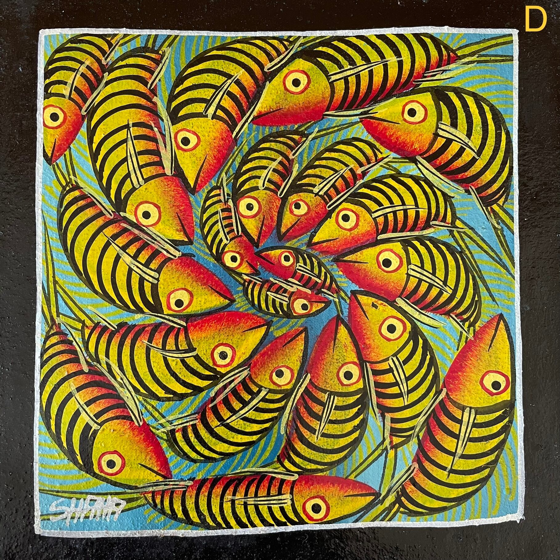 カラフルで躍動感のある魚を描くのが上手いアーティスト、作品のサイズは小さいですが見ているだけで元気をもらえます。そのままでも飾ることができますが、額装にするともっと素敵になりますよ。新築祝い、お誕生日や記念日などの贈り物にいかがですか。